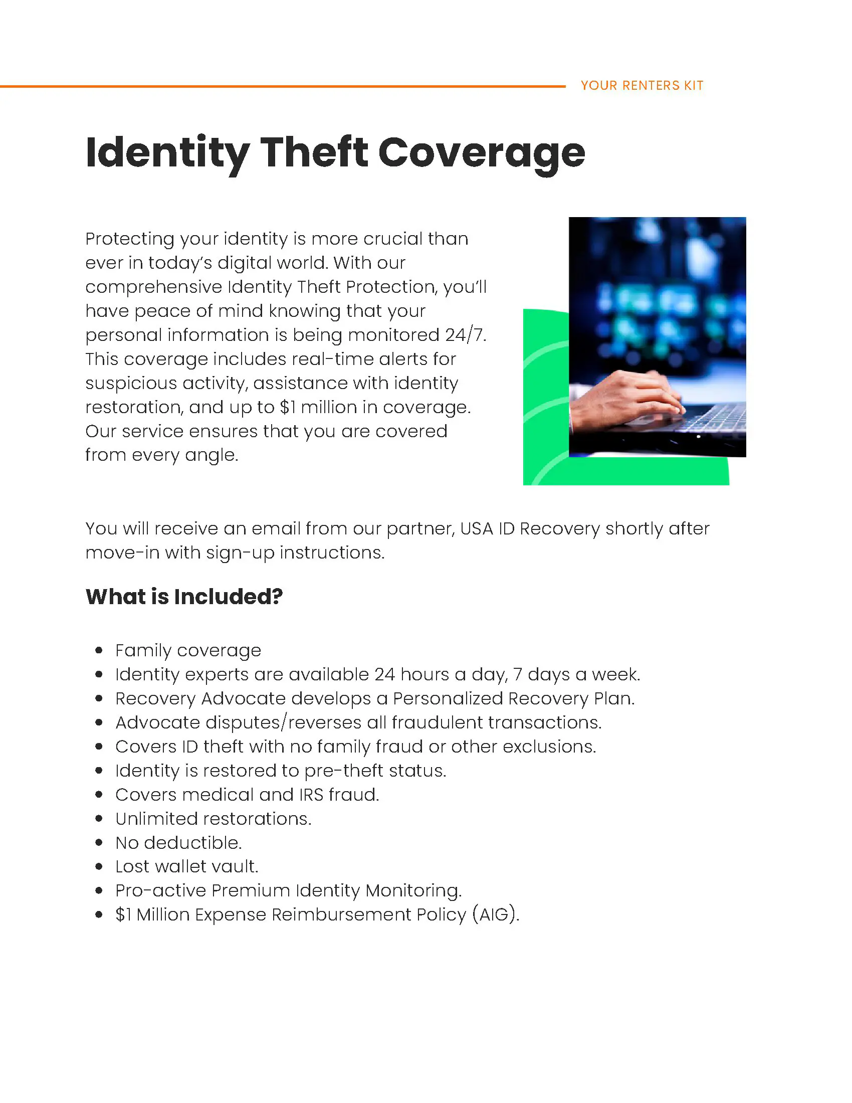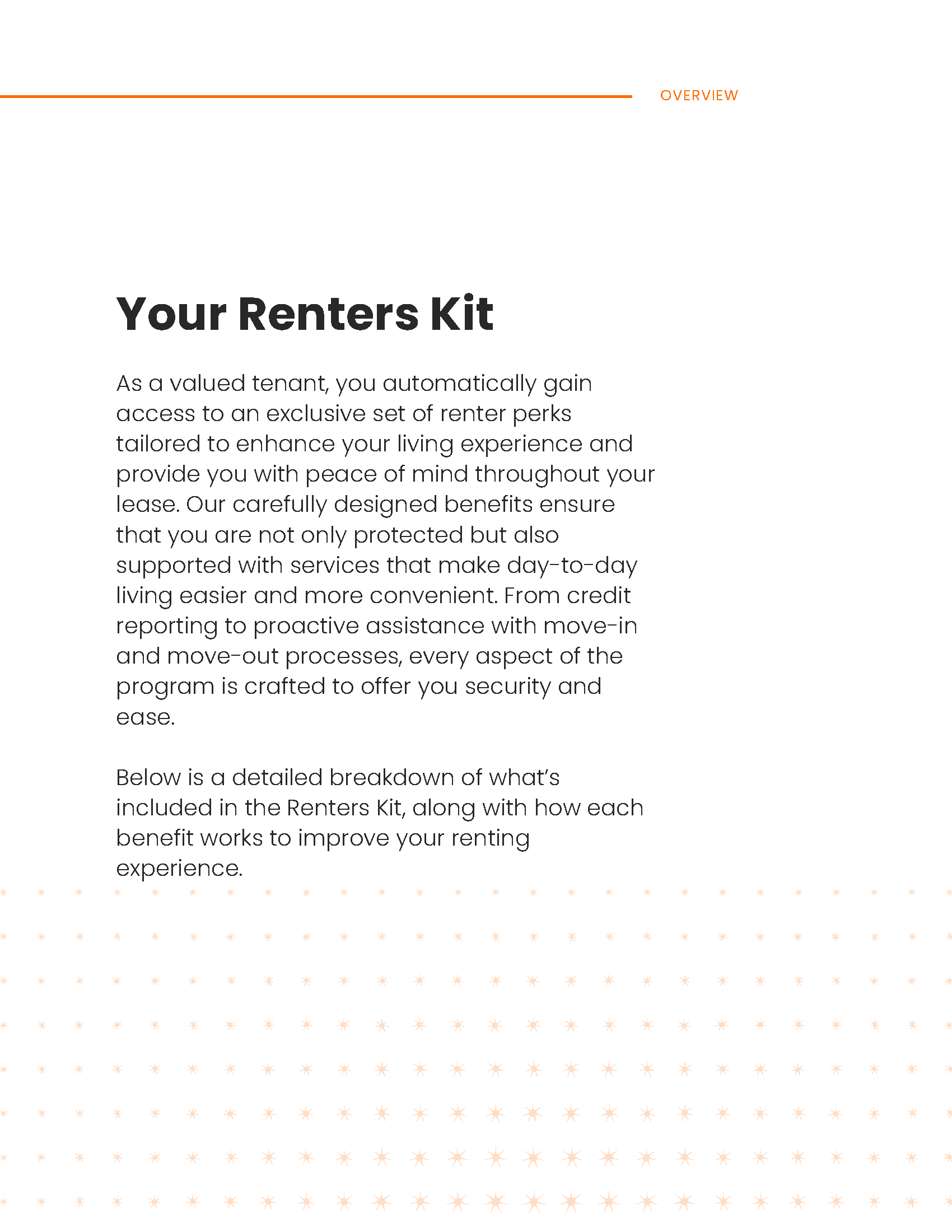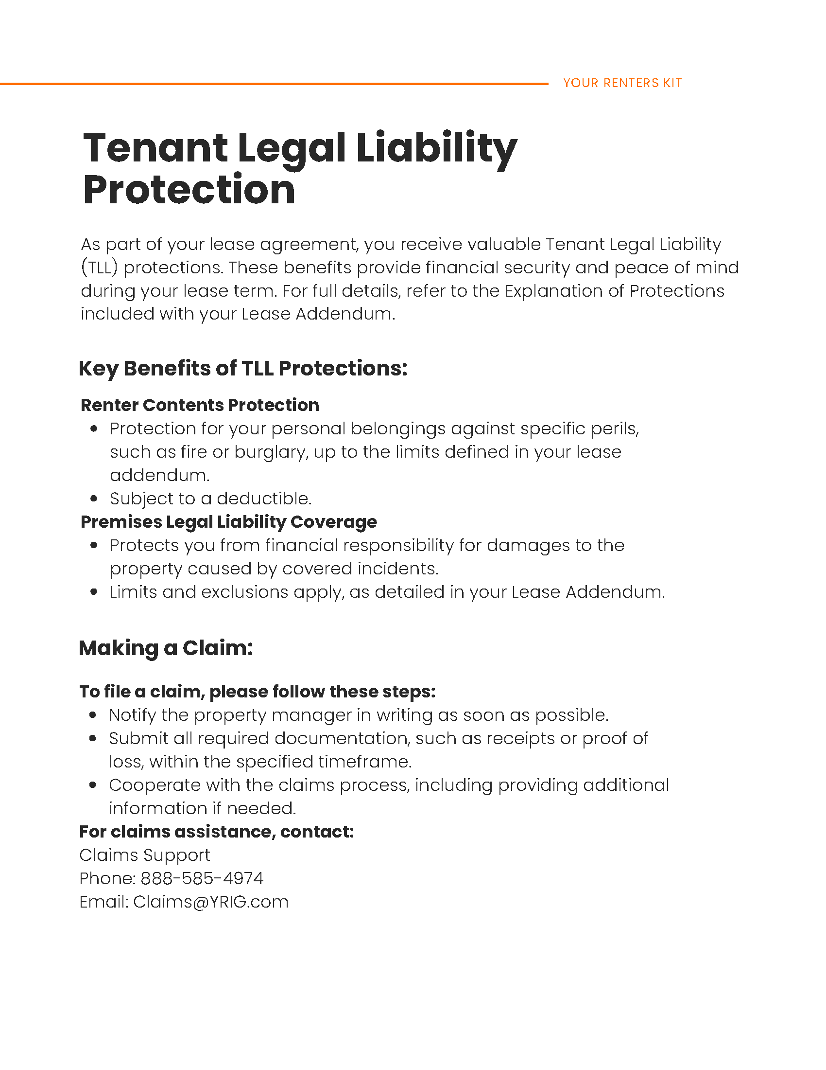 Option 1: Do nothing. Tenant will be automatically enrolled into an insurance policy as part of the Resident Kit Benefits Package. No further action is required. Coverage will begin on the effective date of Resident’s lease and continue throughout the lease term. Please refer to the evidence of insurance that is supplied by Five Star Property Management for additional coverage details. The Resident Benefits Package monthly rate will be adjusted by the premium amount in the policy.